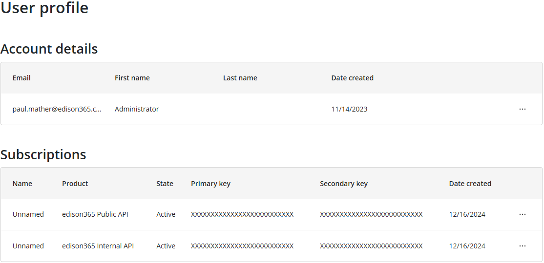 You have two keys available to use in your API requests. Both are personal to you and should not be shared - anyone with this key can access all data in the instance. At any point, you can use this page to see your keys, or if necessary, regenerate the keys. If you choose to regenerate them, you'll need to update your key anywhere that it's in use